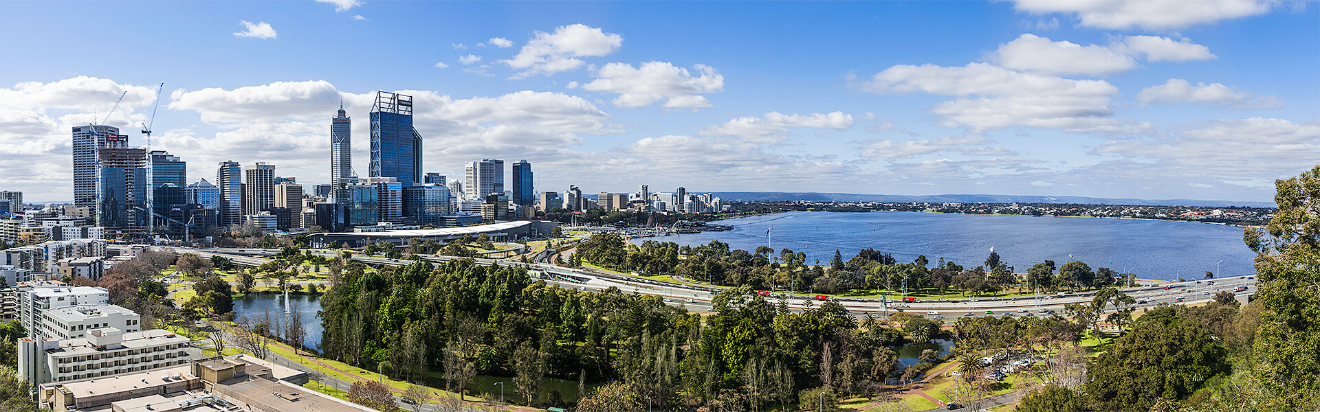 Es eröffnet sich ein Überblick über das Zentrum von Perth, den Swan River und das südliche Perth.