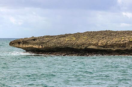 Zerklüftete und durch Wasser geformte, seltsam aussehende Felsen schauen aus dem Wasser.