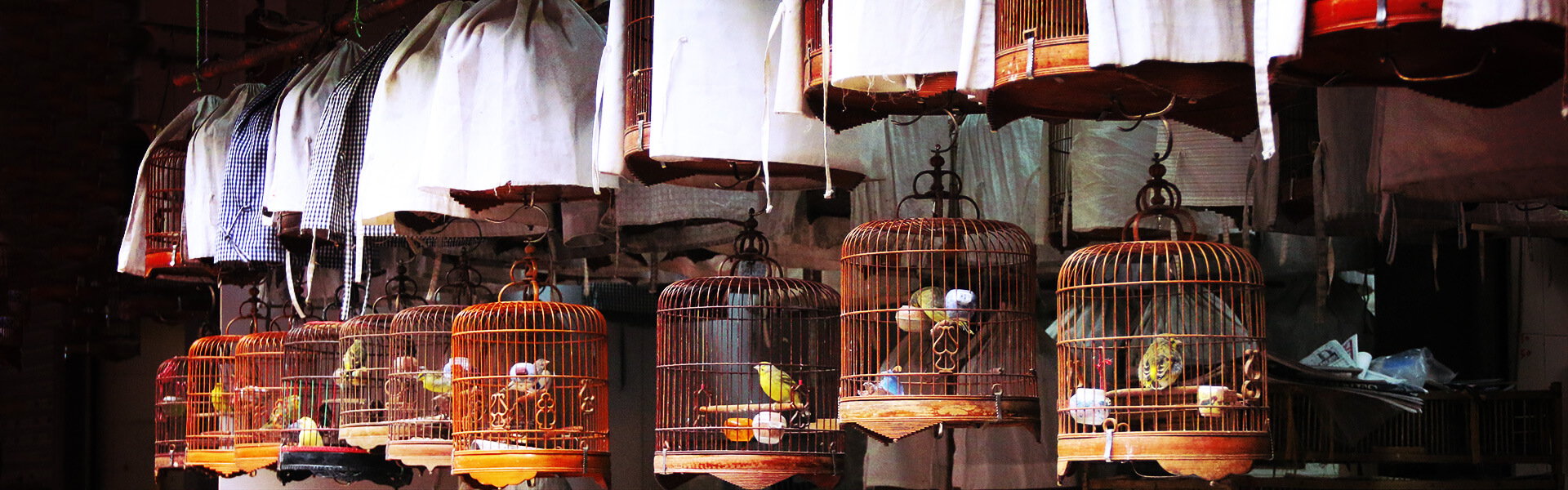 Dazu gibt es so typisch asiatische Vogelkäfige und Futter für die Vögel.