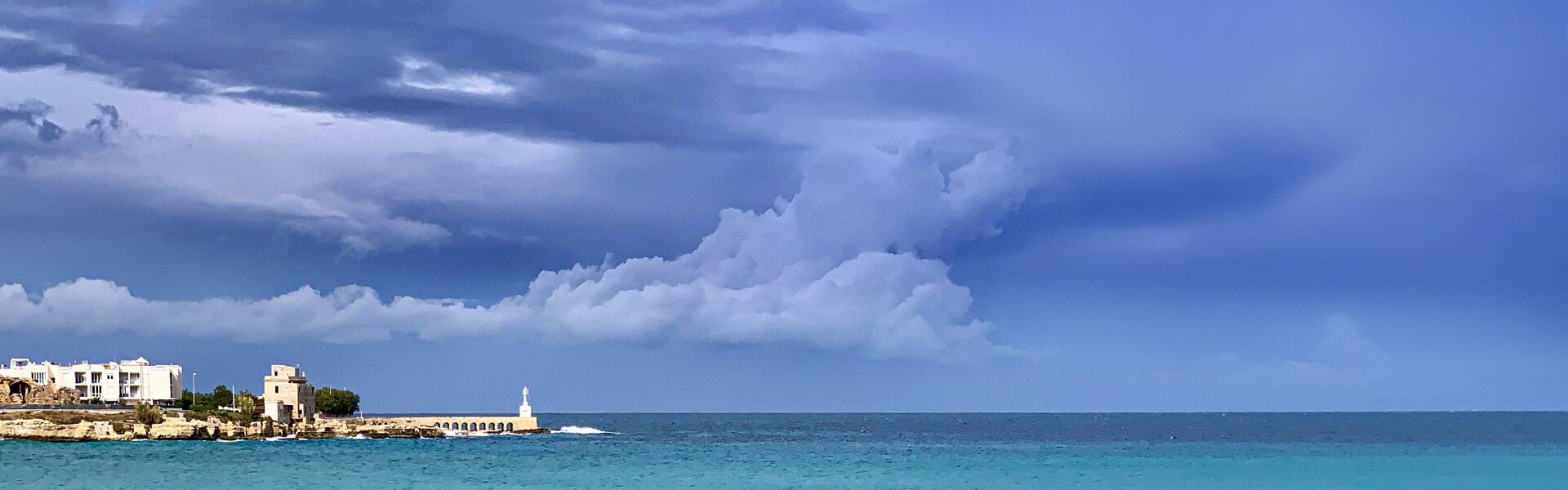 Der Himmel in Otranto täuscht. Der will nur spektakulär aussehen. Und ist absolut ungefährlich. Hier gibt es nicht einmal Pfützen. Was ja erfahrungsgemäß auf starken Regen hinweist. Vielleicht aber ist der Boden außergewöhnlich durchlässig. Aber das ist auf die Schnelle nicht ermittelbar und sofern auch uninteressant.