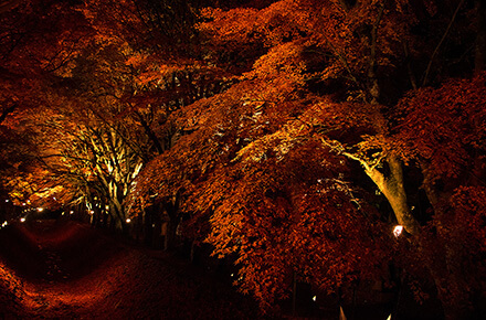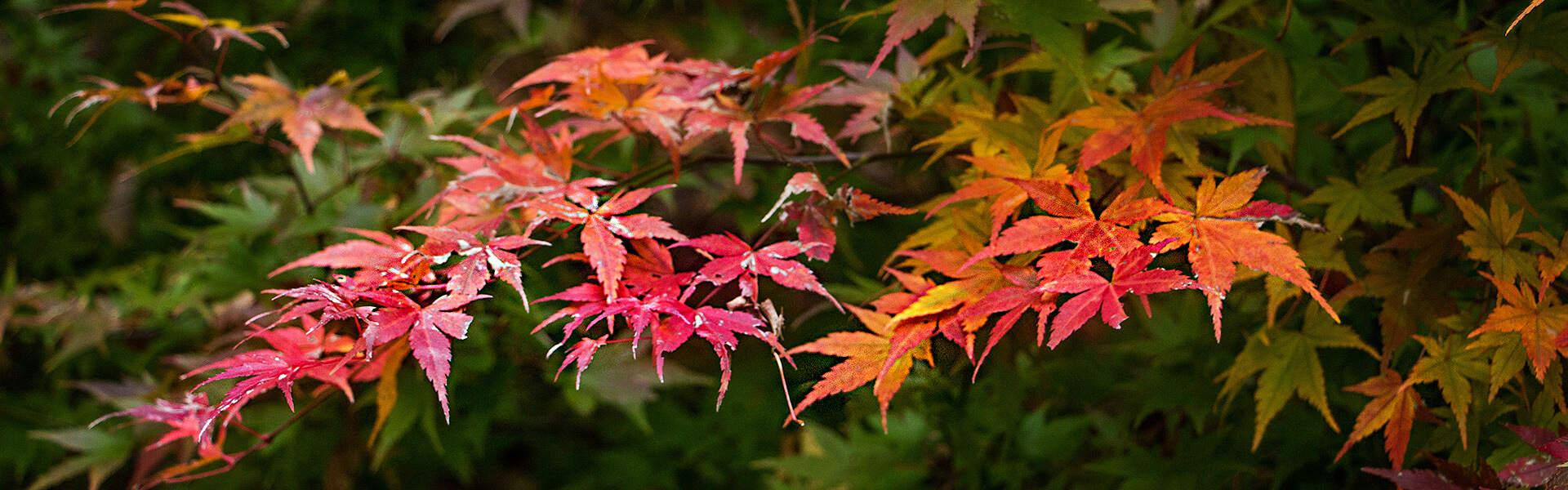Die roten und orangenen Ahornblätter bekommen mit dieser Beleuchtung noch intensivere Farben.