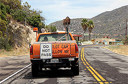Pilotfahrzeuge "lotsen" uns ganz sicher an der Baustelle vorbei und das dauert.
